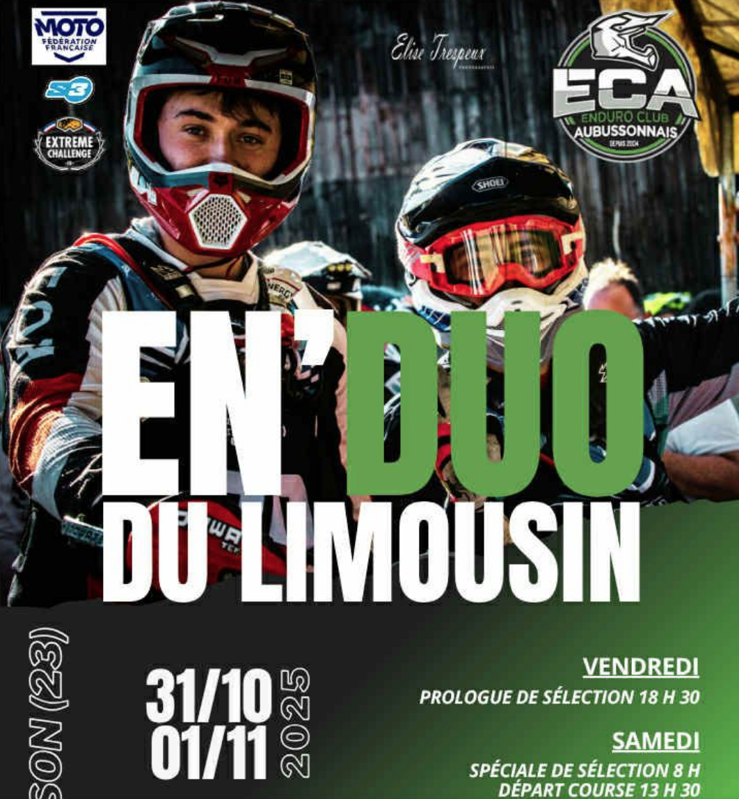Ce week-end on oublie Netflix et les pantoufles: direction Aubusson, où 215 équipages d’enduristes vont en découdre sur les chemins escarpés du Limousin. Oui tu as bien lu: 430 motards lancés dans une épreuve qui sent bon l’huile, la poussière et l’adrénaline – le tout avec un champion du monde dans la mêlée.